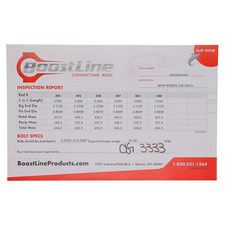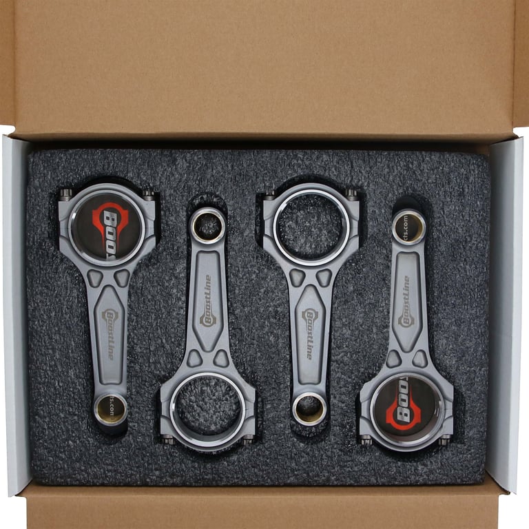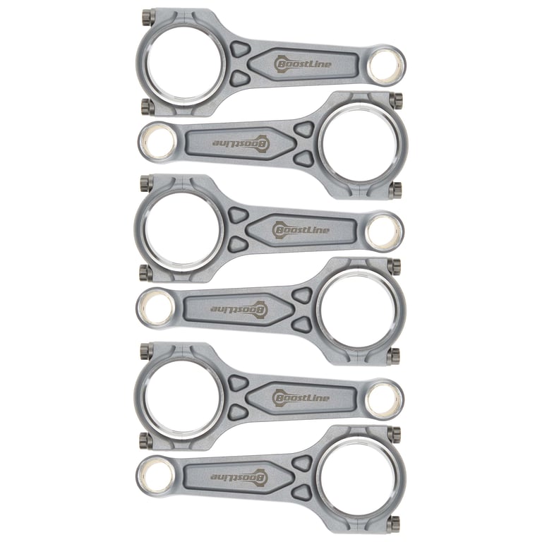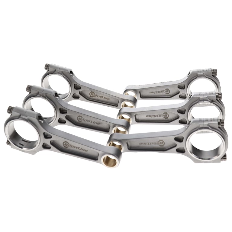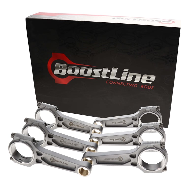 BoostLine connecting rods are designed and built for the stressful demands of high-powered, forced induction and nitrous engines. Proven in the lab and on the track in 1,500HP+ five and six-cylinder engines from the iconic 2JZ to EcoBoost 3.5Ls to Audi RS2s, BoostLine rods are forged from premium 4340 steel and utilize a patented, three-pocket design, maximizing strength while minimizing rotating weight. This revolutionary design dramatically improves each rods' big-end stability under tensile loads and provides a 60% improvement in bending strength and 20% stress reduction in tension compared to H-beam designs, benefits crucial to durability in four-digit-horsepower engines. Each rod is equipped standard with industry leading ARP hardware and is subject to a 26-point, CMM inspection with all critical dimensions provided via an inspection card included with every set of rods. BoostLine connecting rods are the complete package for every performance build, from powerful projects to all-out race cars.